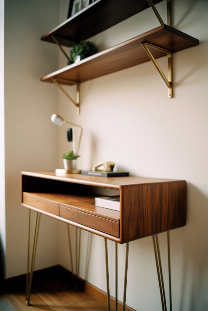 Expert organizers recommend pairing narrow desks with wall-mounted storage solutions to compensate for the limited desktop space—floating shelves, pegboards, or magnetic strips keep supplies within reach without cluttering the work surface. This configuration is particularly effective for people who work primarily on laptops and don’t need space for extensive paperwork or multiple monitors. Prices for quality console desks range from $150 to $600, making them an affordable option for first apartments or guest room offices.