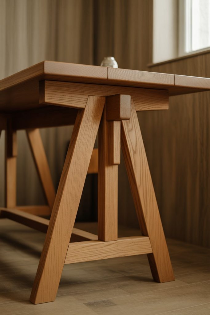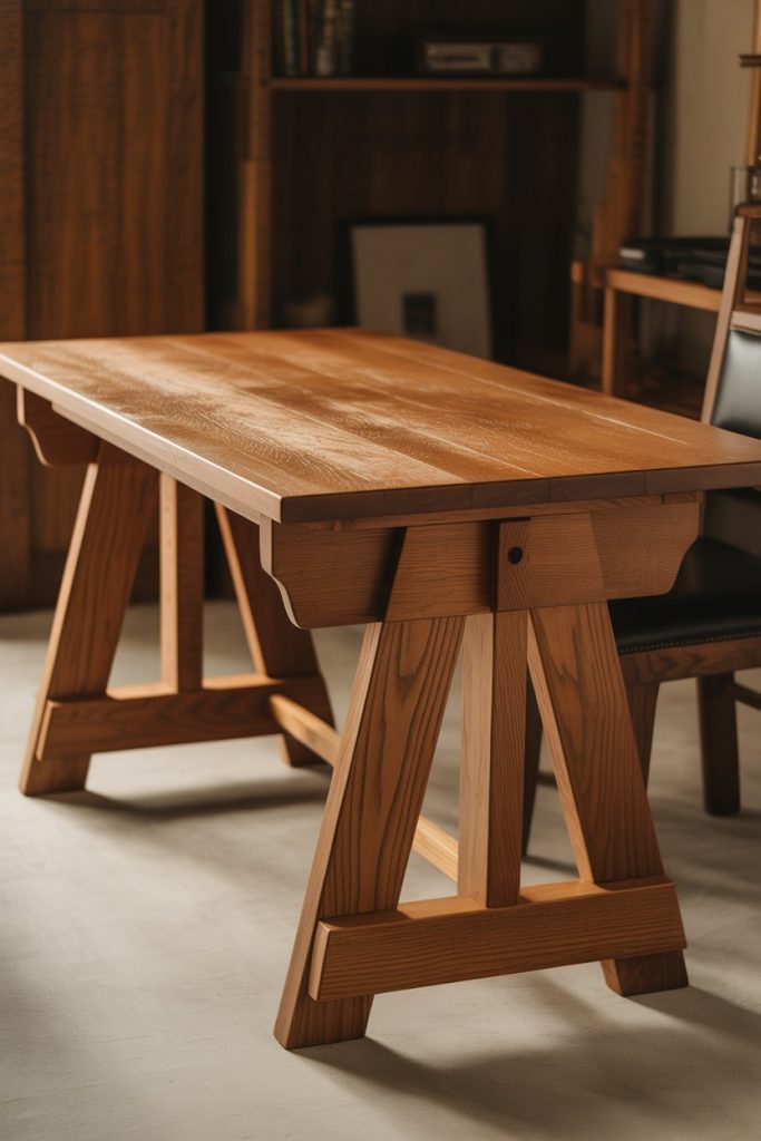 The sturdy, architectural form of a trestle desk—with its distinctive A-frame supports and substantial top—brings a sense of permanence and craftsmanship to home offices that value traditional construction methods. Originally designed for heavy-duty work, modern trestle desks balance that structural heritage with refined finishes and proportions suitable for residential spaces. This style works particularly well in rooms with high ceilings or period details where the desk’s strong lines complement rather than compete with the architecture.
