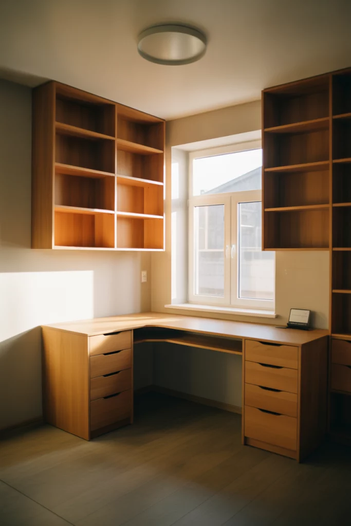 When floor space is limited, a corner built in desk that floats against the wall maximizes every inch while maintaining a streamlined, uncluttered appearance. This configuration is ideal for small apartments, guest bedrooms, or any area where you need to carve out a productive workspace without sacrificing mobility throughout the room. The floating design also makes cleaning underneath effortless—a practical bonus that busy professionals truly appreciate.