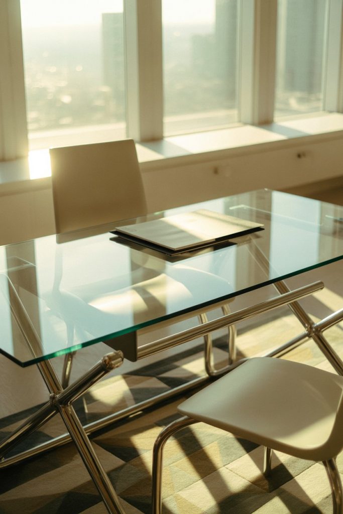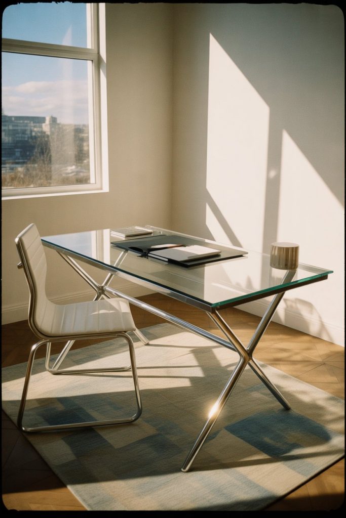 A modern glass-top desk supported by a polished chrome or stainless steel frame creates an airy, almost invisible presence that’s perfect for small spaces or contemporary home offices where you want to maintain visual flow. The transparent surface allows light to travel through the room unobstructed, making it an excellent choice for apartments with limited natural light or rooms painted in darker colors. This style communicates sophistication and contemporary taste without feeling cold or sterile.