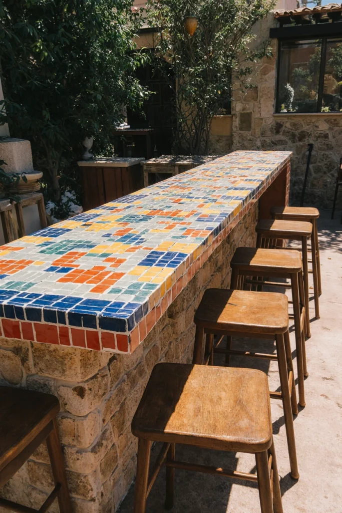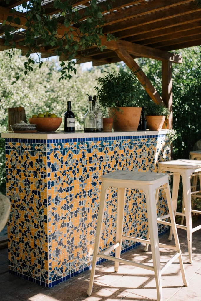 Making a tile-topped bar in DIY mode gives provision to bring in flashes of color and vibrant patterns. By slipping into a bit more artistic radar, this opens the gates of creativity, turning that mere soft-centered point into the eruption point of these high-staged indoor-outdoor glees. Tile really finds its glory in sunny backyards/perched over the hot Mediterranean patio.