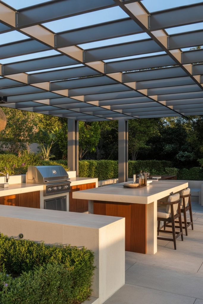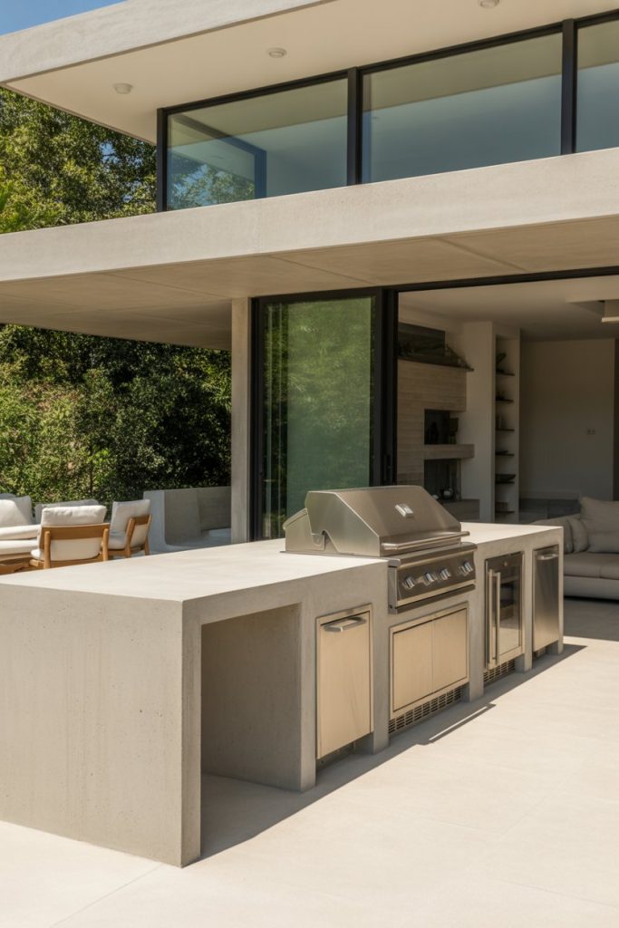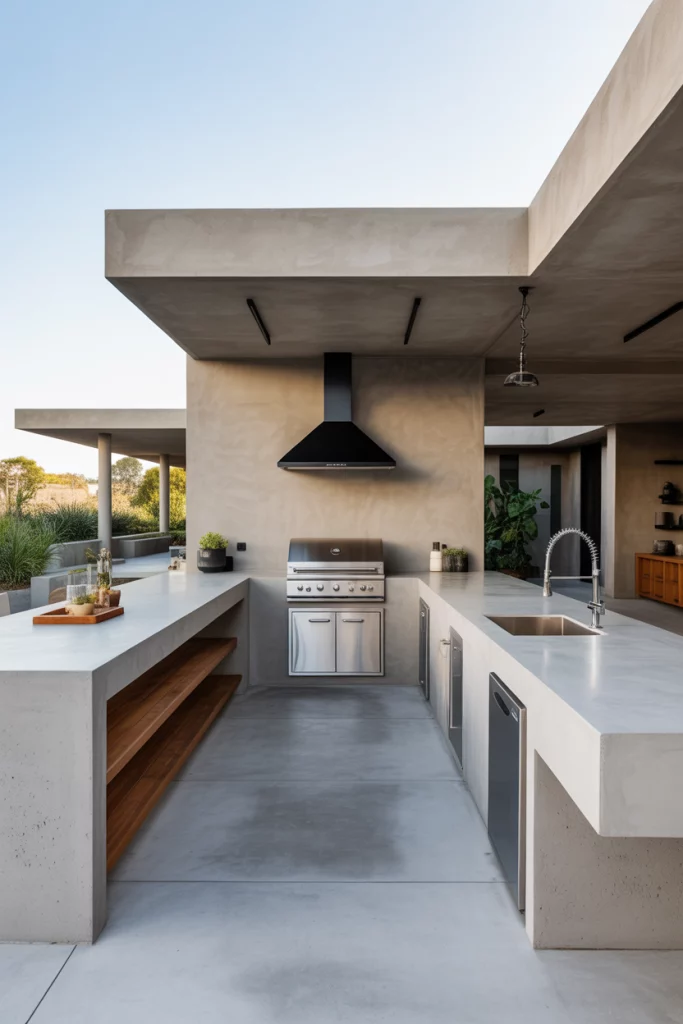 A modern outdoor kitchen focuses on a clean layout, straight lines, and sleek finishes. It works well for homes with sliding doors or large patios where indoor and outdoor areas blend easily. I’ve toured homes with concrete counters and steel cabinets, and homeowners say this minimal style makes summer hosting feel effortless and uncluttered.