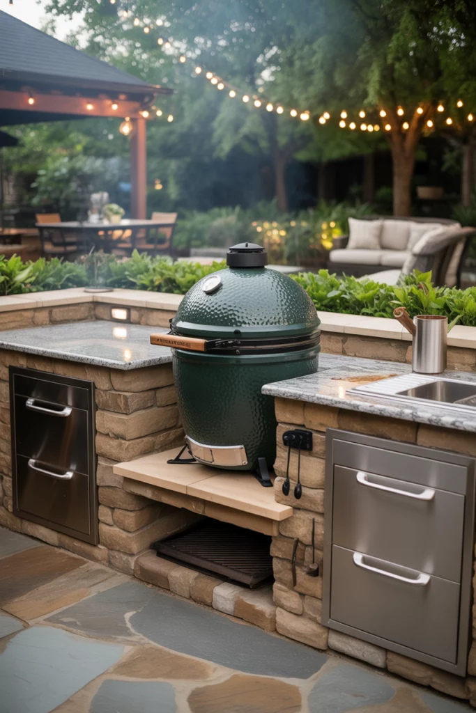 A dedicated Big Green Egg station gives serious grillers the power to smoke, bake, and roast outdoors. Its ceramic body fits well in covered kitchens or open patios. Many backyard cooks love creating weekend traditions around it, especially during summer gatherings. I’ve seen people customize sturdy bases from stone or wood to blend with their yard’s design.