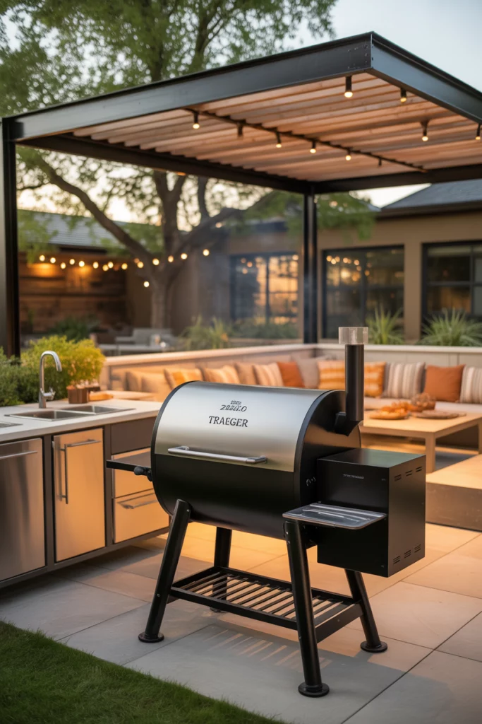 Pairing a Traeger with a lounge-style seating area creates a relaxed cooking zone. Homeowners often place it near shaded pergolas or open decks so guests can enjoy the smoky aroma while chatting. This idea works for both large yards and small backyard setups. Friends who own Traegers say the ritual of slow-smoking became their favorite weekend activity.