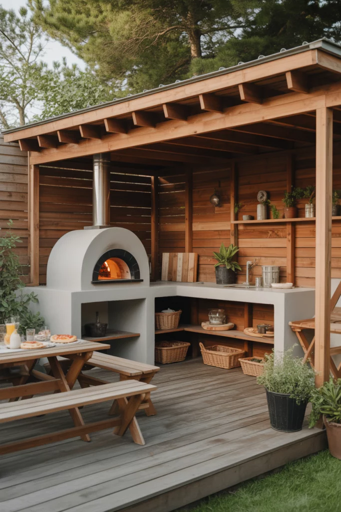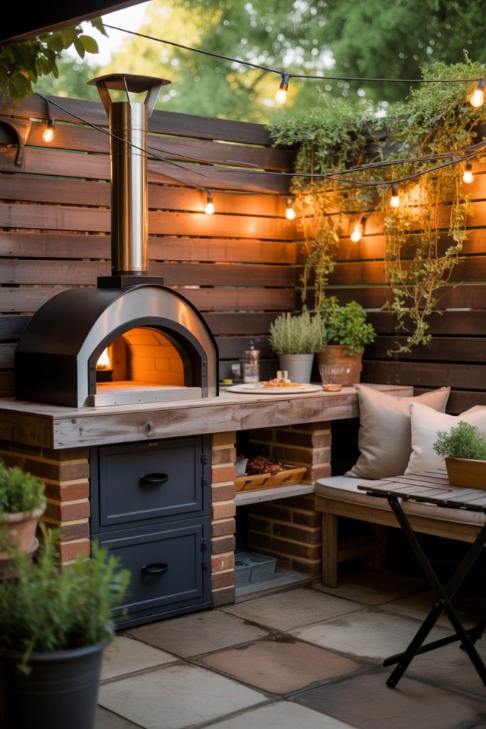 A dedicated pizza corner adds fun and flavor to any backyard. Homeowners often combine compact ovens with prep tables and shaded seating. This setup fits both modern and rustic styles and becomes a favorite for family nights. I’ve watched kids get excited about making their own pizzas, turning simple dinners into memorable moments.