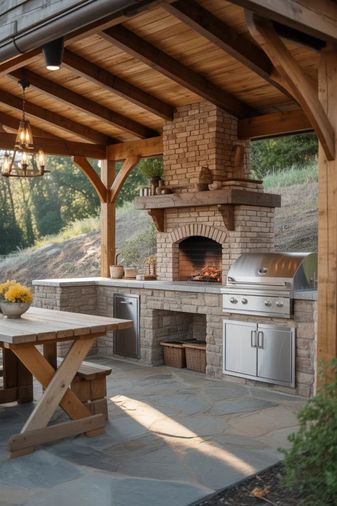 A rustic outdoor kitchen uses stone, reclaimed wood, and brick to create a warm, grounded space perfect for casual gatherings. This style fits cabins, suburban homes, or large patios. Many designers say rustic kitchens feel more personal, and I’ve noticed guests naturally gravitate toward them because they feel welcoming and relaxed, especially during summer cookouts.