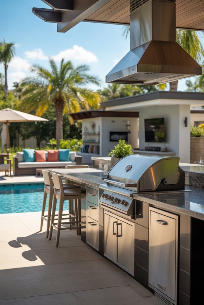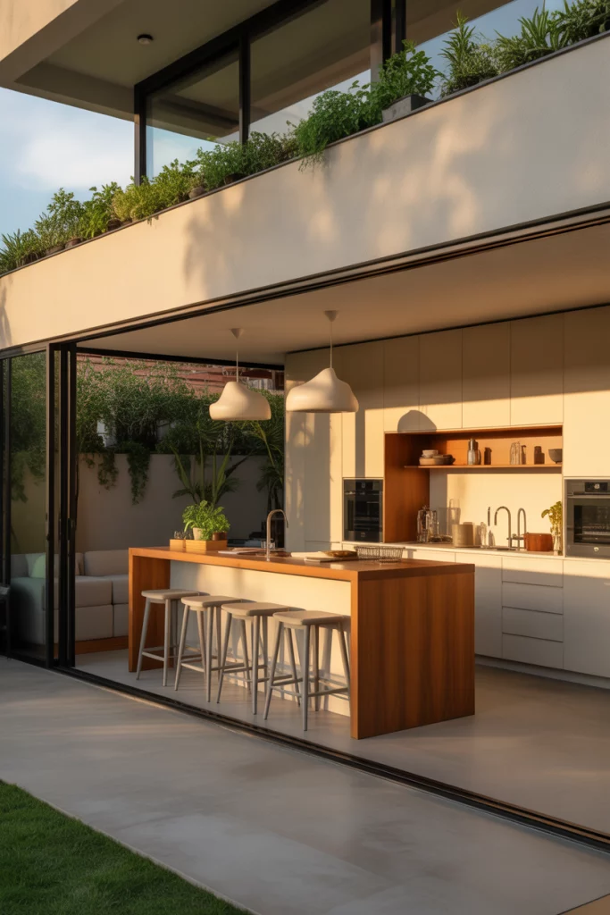 Placing a small kitchen beside the indoor dining area creates a cozy breakfast patio. This idea works well for morning coffee stations, griddles, or compact grills. Designers often recommend using the home’s wall for shelter and storage. I’ve enjoyed visiting homes where breakfast outdoors felt effortless thanks to the proximity to the kitchen.