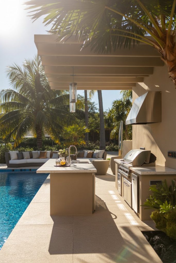 A kitchen near a backyard pool creates a true summer retreat where people can grill, mix drinks, and relax without running indoors. Designers recommend shaded counters and waterproof finishes. Growing up, I visited relatives who had a small poolside grill, and their home always felt like a vacation spot where weekends stretched endlessly.