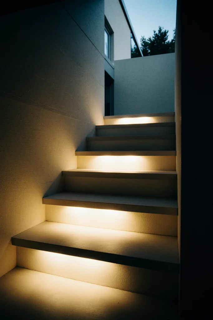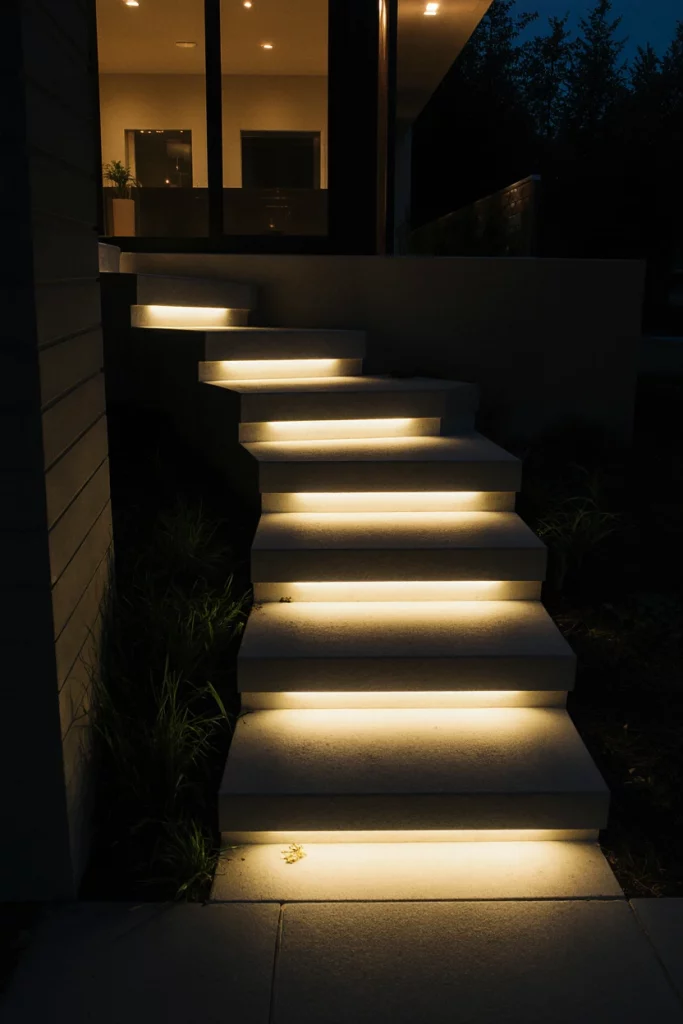 Adding LED strips under outdoor stairs creates a subtle, cozy glow that’s both stylish and practical for house entrance steps or backyard patio decks. This modern look is easy to install as a DIY project and adds a touch of architectural polish, and it is especially recommended by lighting specialists for visibility and safety. It’s also a great trick for small porches that need nighttime depth.