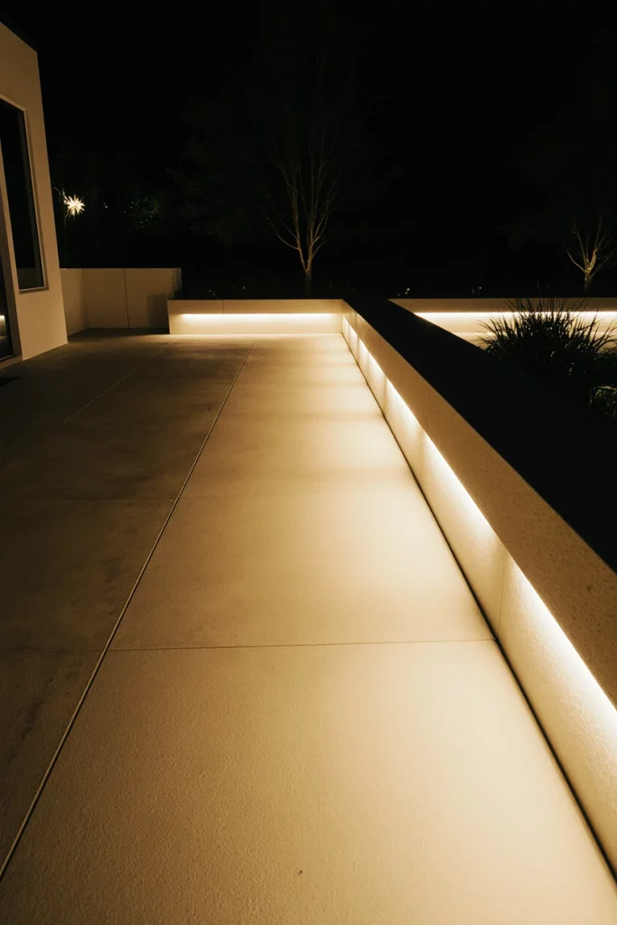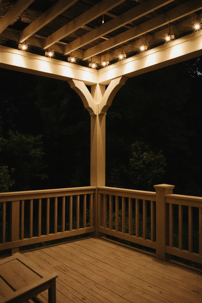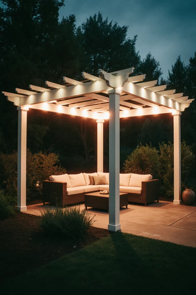 Lighting mounted along pergola beams transforms a simple patio into a comforting retreat. Warm LEDs hidden along the wood beams feel cozy, while clean lines maintain a modern aesthetic. This idea is frequently seen in backyards where families want an inviting evening zone without harsh overhead lights. Many homeowners choose to handle installation as a weekend DIY project.