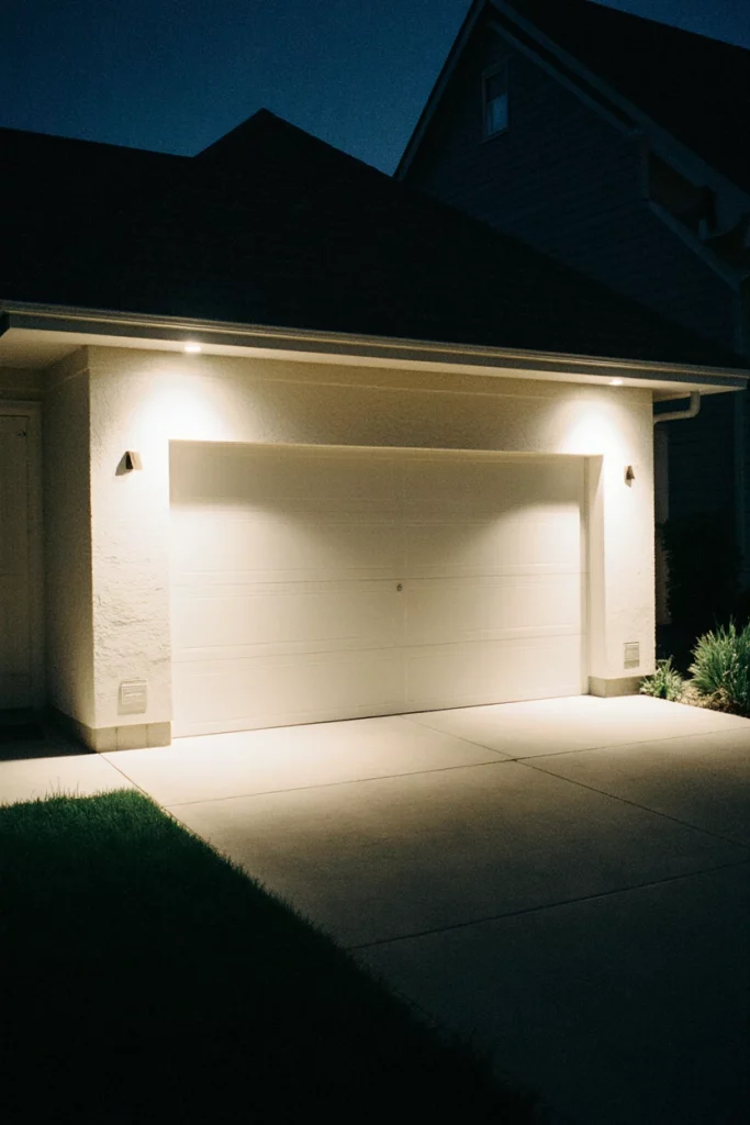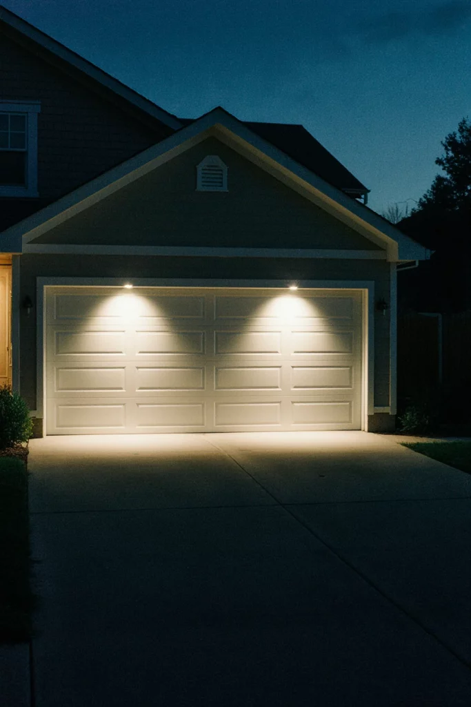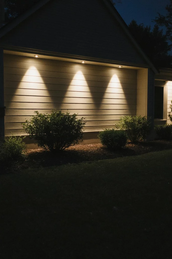 Highlighting the garage frame with directional lights enhances nighttime visibility and curb appeal for the house. This idea feels modern and blends well with both rustic exteriors and clean architectural designs. Homeowners choose this method when they want the house entrance door and driveway to feel more polished without overlighting the space.