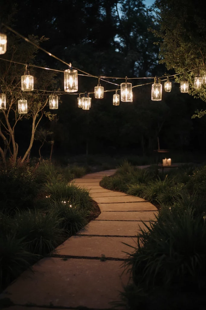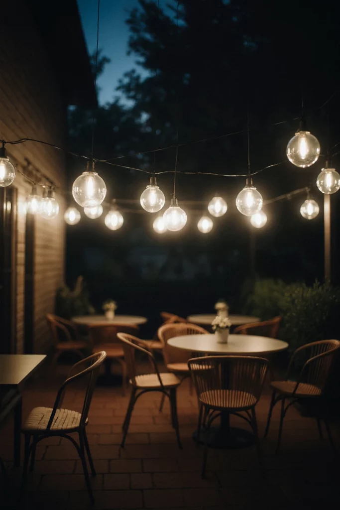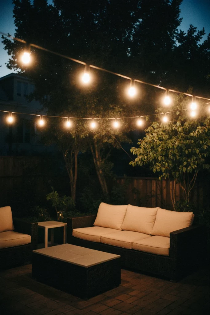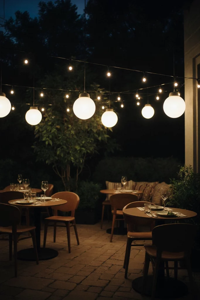Globe-style hanging lights add a chic, modern charm to patio seating areas and backyards. Their round shape softens the atmosphere and creates a relaxed, cozy feel that bloggers often compare to trendy outdoor cafés. These fixtures look beautiful clustered under a pergola or hanging from a strong tree branch.