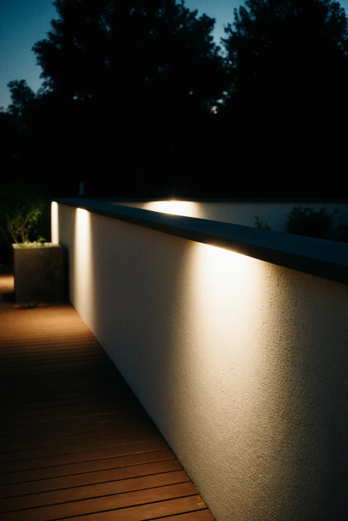 Lighting integrated into deck rails gives backyard patio spaces a smooth, architectural glow. This modern style looks seamless and is a favorite among designers who avoid bulky fixtures. It provides gentle, cozy illumination perfect for small gatherings, and many versions can be installed as a DIY weekend project.