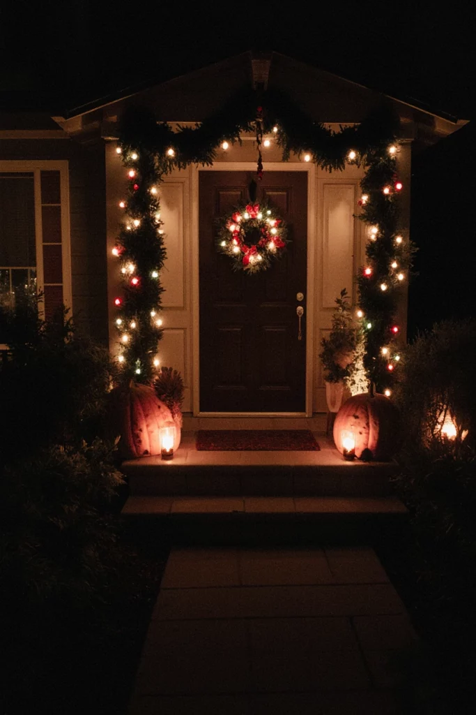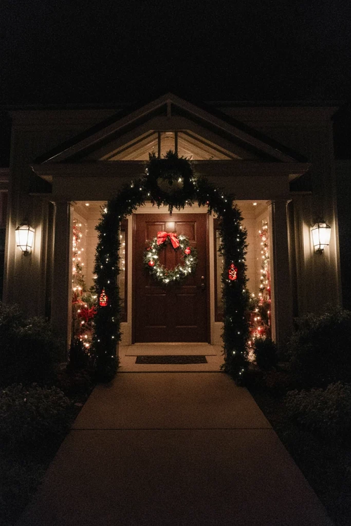 Seasonal lighting for Christmas, Halloween, or Diwali can turn any house entrance into a festive display. Many homeowners combine wreath lights, outline LEDs, or themed figures to create Christmas house decor that feels joyful rather than overwhelming. A few warm spotlights can highlight the house entrance entryway, ensuring everything stays cozy and welcoming. Designers at Better Homes & Gardens often recommend mixing warm and cool tones for balance.