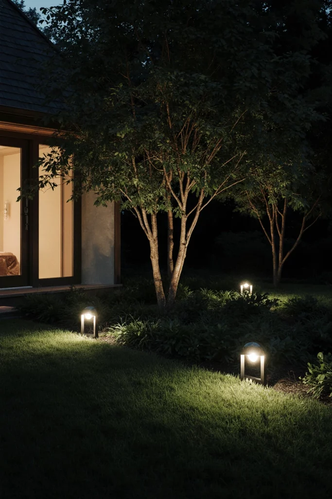 Bollard lights are a sleek way to illuminate front yards, pathways, or backyards without overpowering the landscape. Their modern look blends beautifully with both rustic gardens and structured walkways, making them a flexible choice for homeowners who enjoy DIY landscaping upgrades. Designers often highlight how bollards provide safe navigation while giving the house exterior a refined nighttime presence.