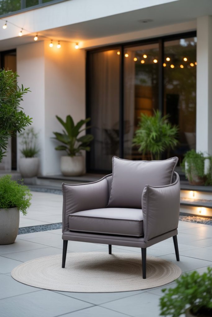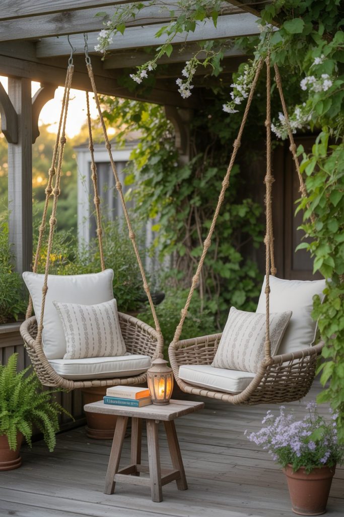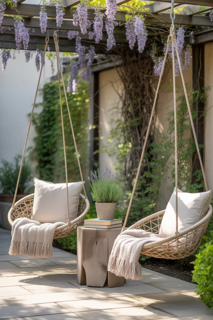 Hanging chairs bring a playful, cozy feel to patios, even in tiny or apartment layouts. This style works for both small spaces modern and large backyards, offering a relaxing corner for reading or conversation. They’re often renter friendly since many designs are freestanding rather than permanent fixtures. Influencers on Pinterest highlight how hanging chairs add both comfort and style.