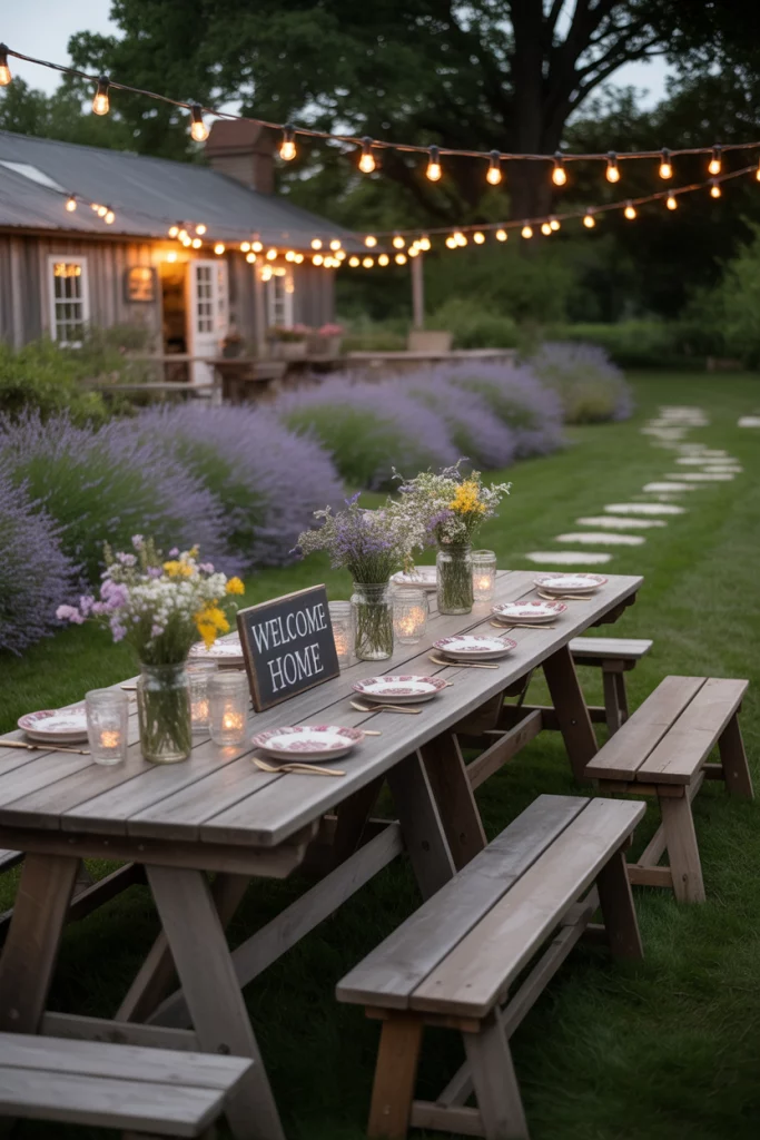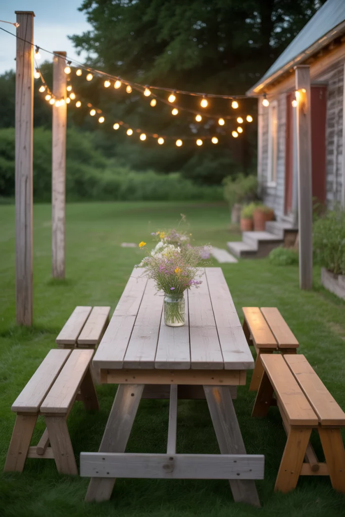 For backyards with room to spare, country farmhouse-style patios offer communal dining charm. A long wooden table, string lights, and benches create a warm, inviting setting. This look blends rustic simplicity with functional decorating, making it ideal for gatherings. Joanna Gaines often spotlights farmhouse patios as a cozy extension of indoor dining.