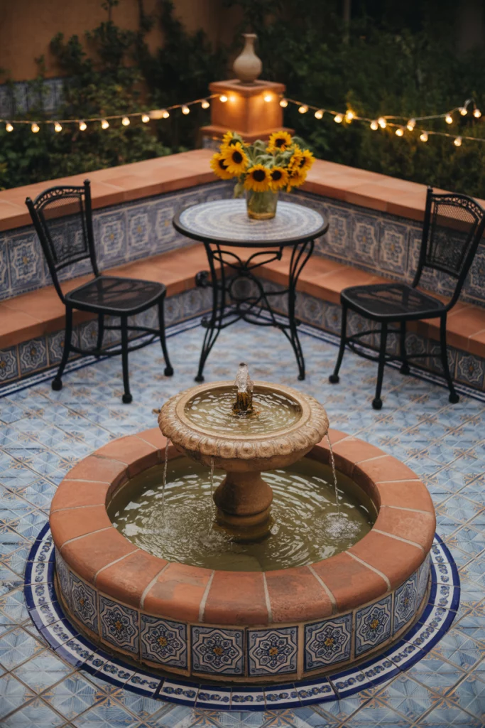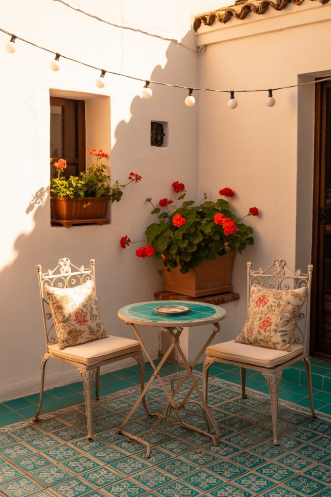 Even small spaces can capture bold charm with Spanish style tiles. Adding patterned tile to a patio floor or accent wall transforms it instantly. This idea is great for apartment balconies or tiny patios where space is limited but style is essential. Designers at Architectural Digest call patterned tile “a decorating shortcut with huge impact.”