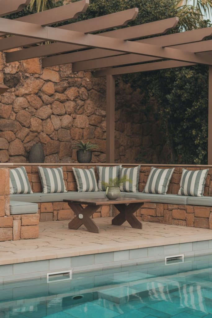 Adding a pool creates endless possibilities for decorating your outdoor patio. Think resort-style seating, shaded pergolas, and rustic touches like natural stone decking. Even if your pool is modest, accenting the edges with lanterns and lounge chairs elevates it. This is a perfect large patio idea that feels indulgent yet practical. Designers on Elle Décor note that blurring the lines between pool decks and living spaces adds functionality.