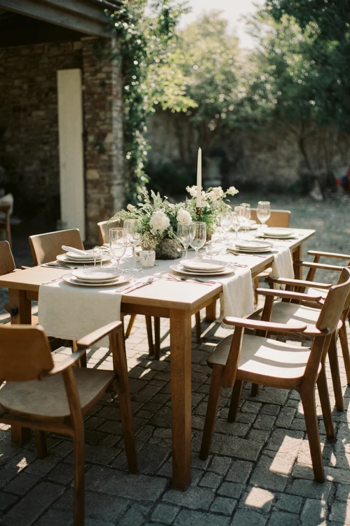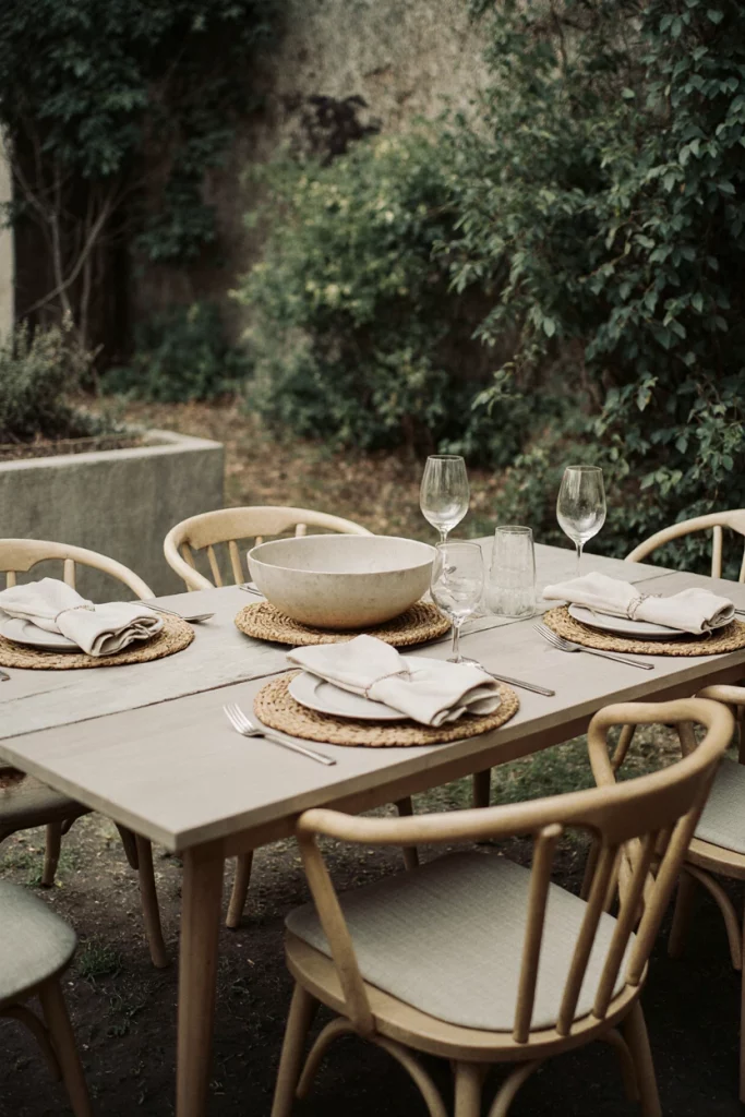 Soft neutrals are shaping Outdoor Table Decor 2026, especially for relaxed afternoons on patios. Pair woven chargers with linen napkins to create a calm, everyday atmosphere. A simple ceramic centerpiece keeps the palette cohesive and works beautifully on round tables too. The look feels effortless yet intentional.