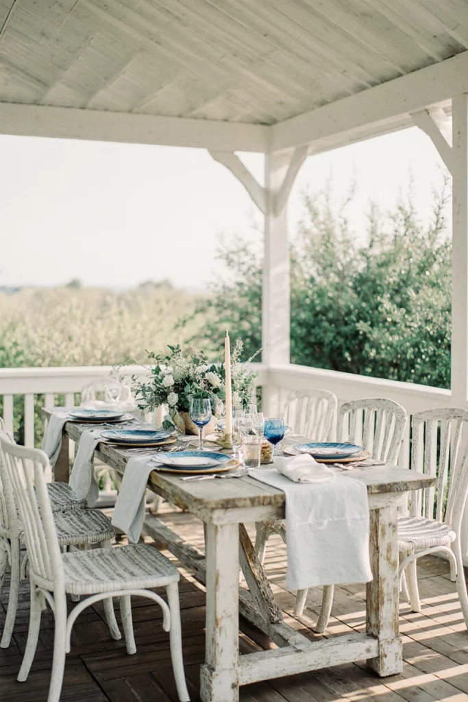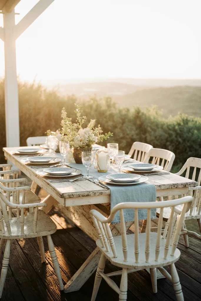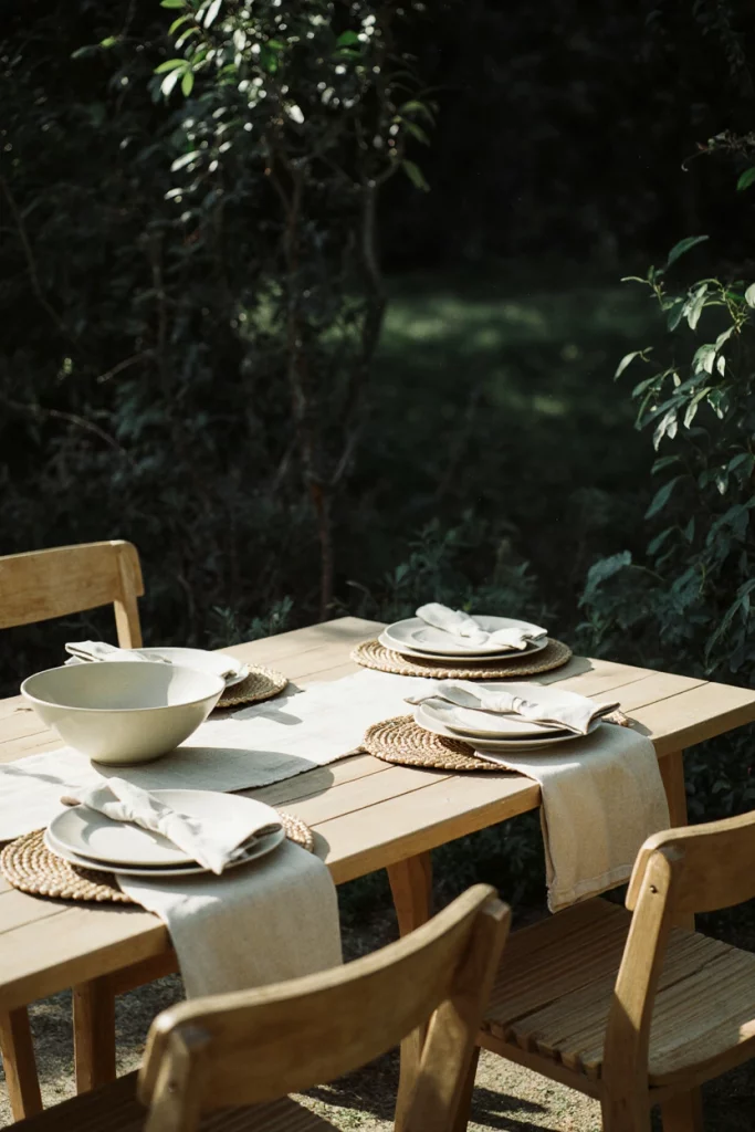 Soft coastal neutrals influence Outdoor Table Decor 2026. Whitewashed wood, pale linens, and summer breeze textures create a calming aesthetic. Pieces in white and muted blue pair beautifully, while patios with natural light enhance the airy feel.