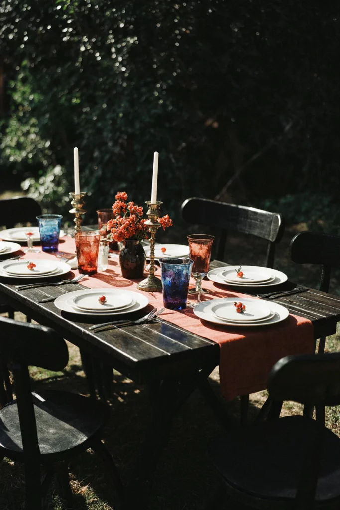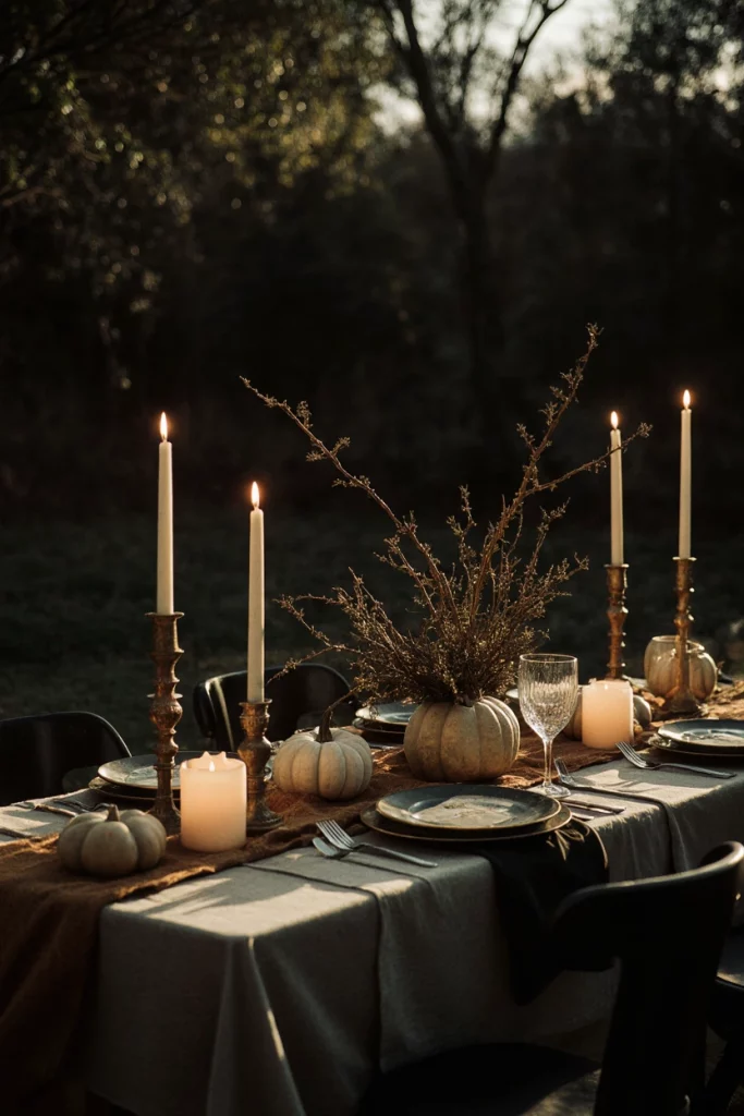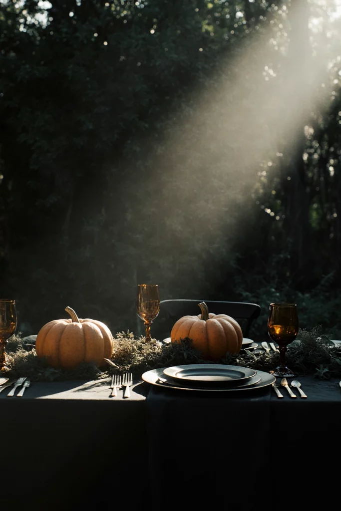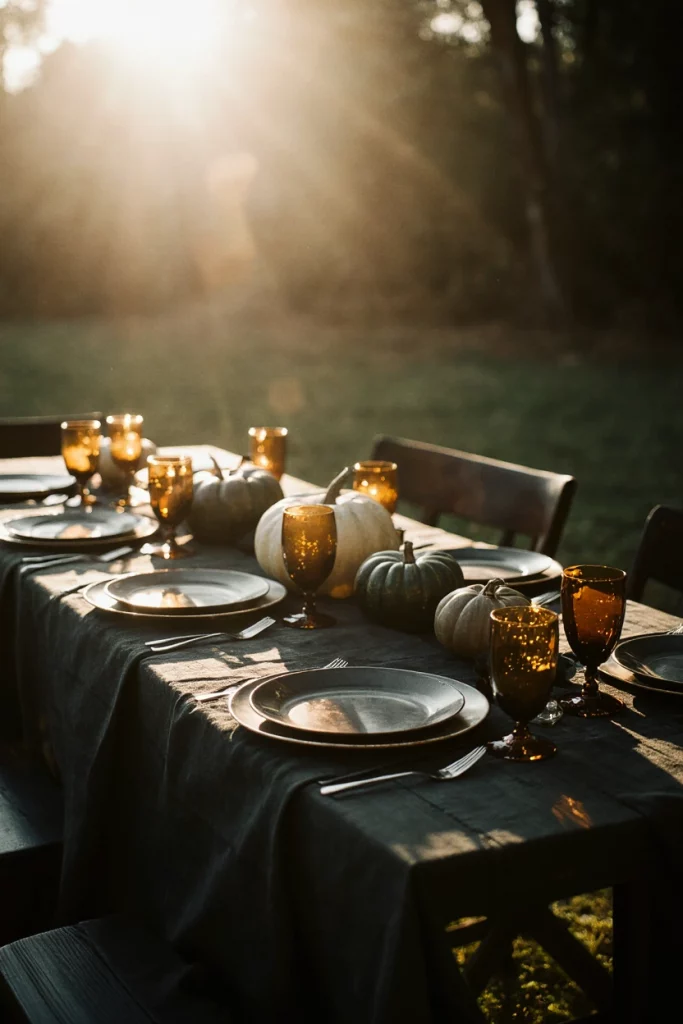 Moody layers set the tone for Outdoor Table Decor 2026. Charcoal linens, amber glass, and subtle pumpkins create a mature Halloween atmosphere. A twist of black accents and ideas like dried foliage elevate the look beyond typical themed décor.