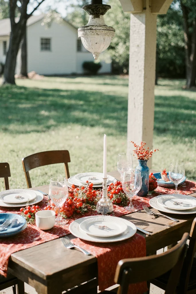 Outdoor Table Decor 2026 is energized by a punchy red-white-blue layout. Lightweight linens are breezy, and fresh berries provide a festive pop to the 4th of July gatherings. A party-ready look like this works with summer heat and casual outdoor dining.