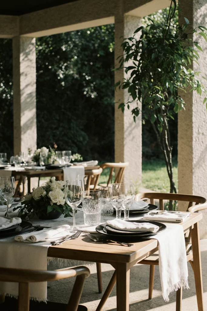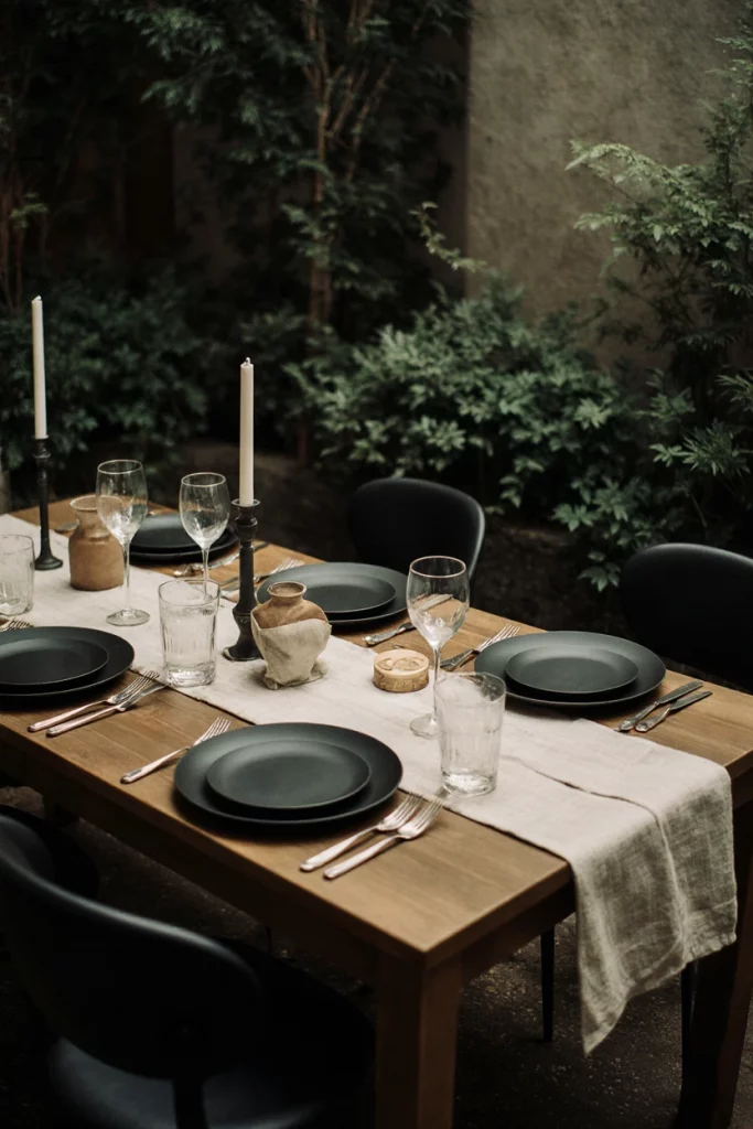 High-contrast styling gives Outdoor Table Decor 2026 a contemporary look. Mix black serveware with white linens for fresh definition. Add simple greenery to soften the edges and keep the table inviting, even in more architectural patios.
