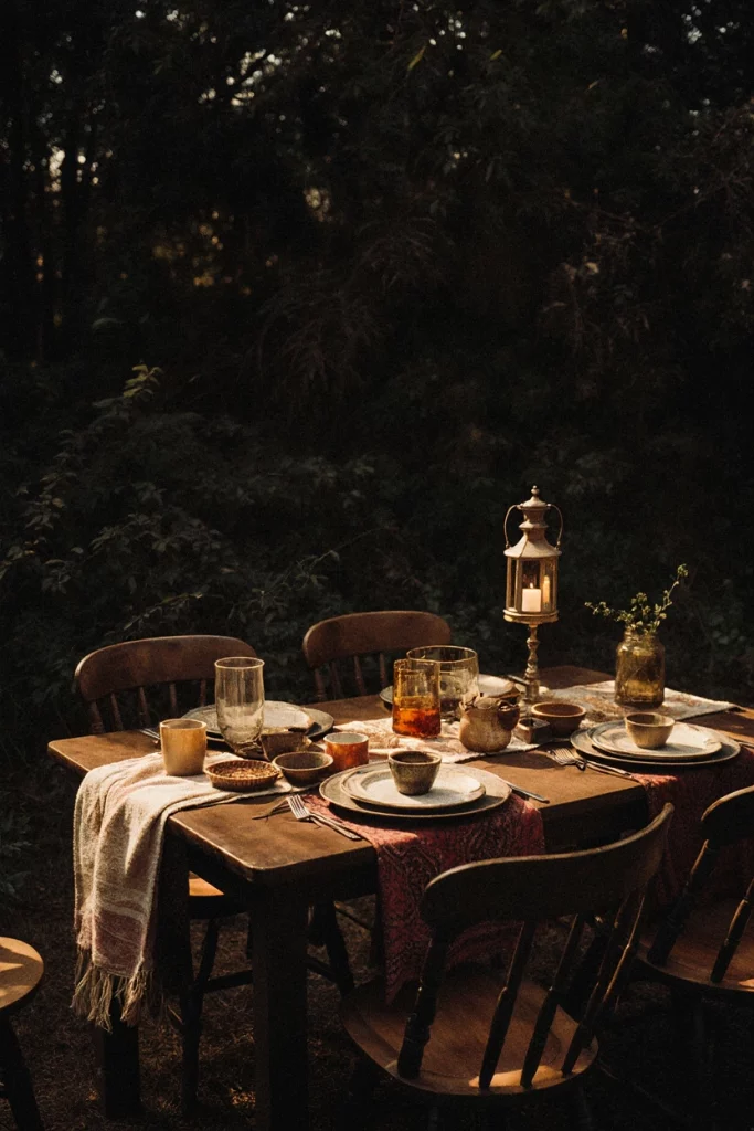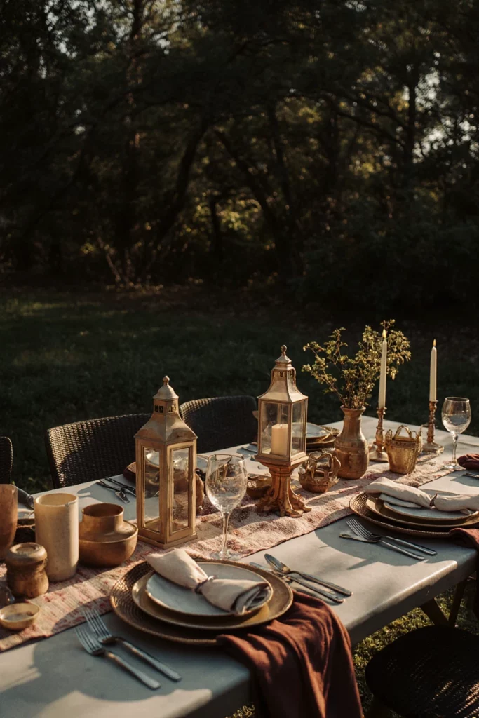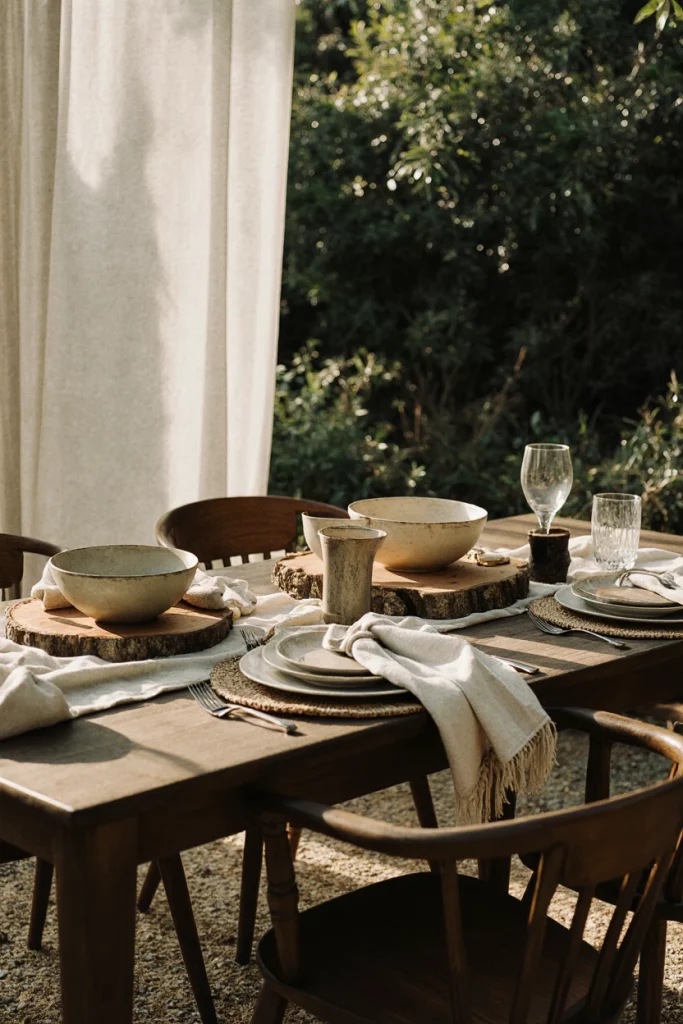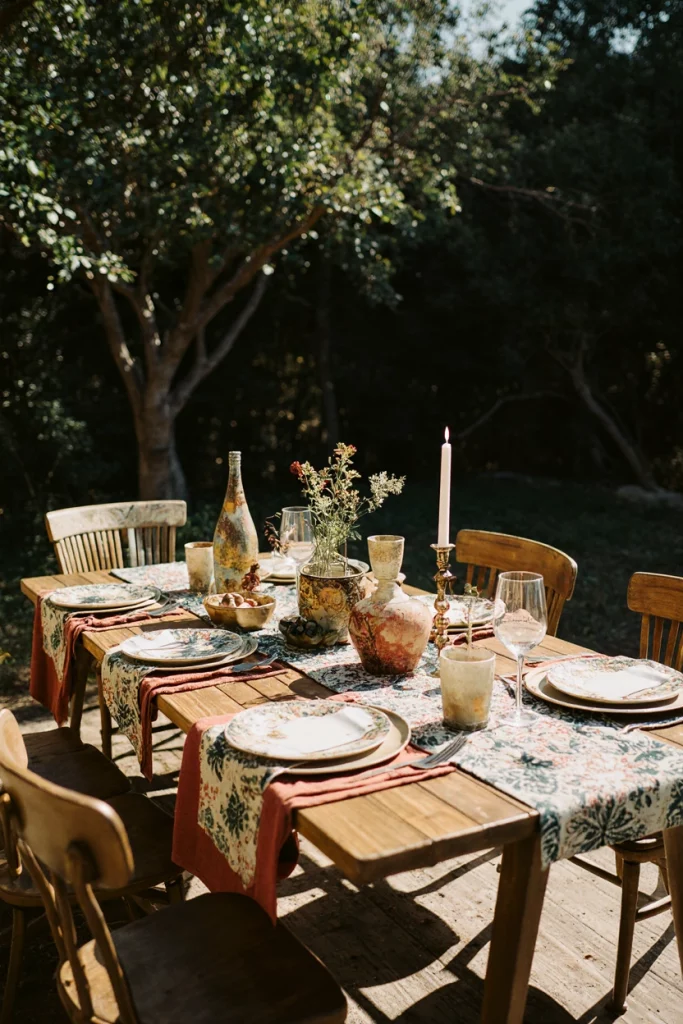 Layered textiles define boho-inspired Outdoor Table Decor 2026. Think woven mats, tasseled napkins, and warm boho colors. A few party-ready accents like lanterns enhance the atmosphere, while simple ceramic ideas help steady the overall look.