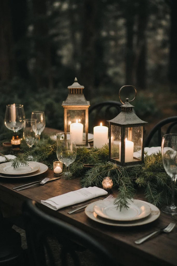 Seasonal touches elevate Outdoor Table Decor 2026 for winter gatherings. Mix evergreen sprigs with warm lanterns for a cozy Christmas feel. A bit of rustic texture and white ceramics balances the holiday palette and keeps the setup grounded outdoors.