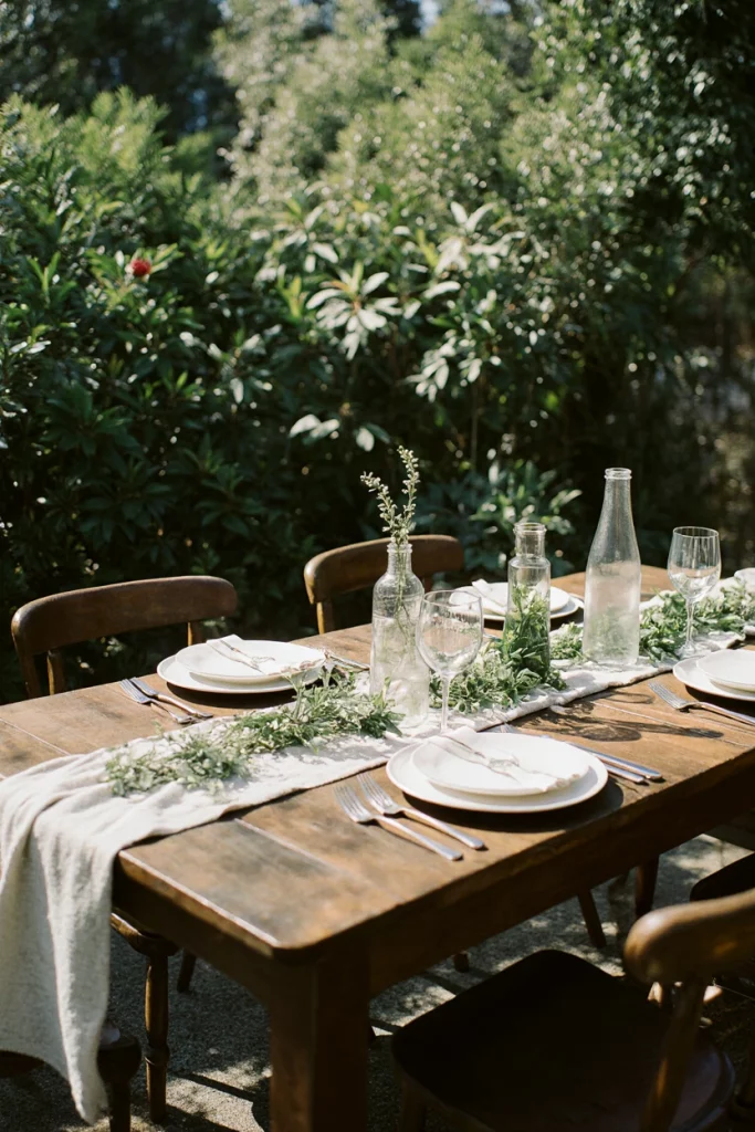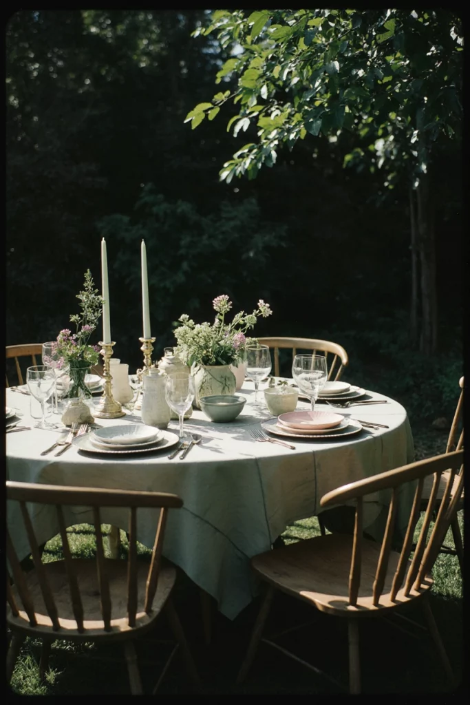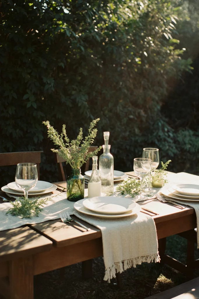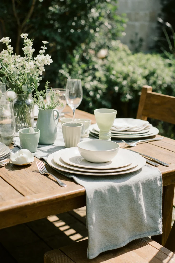 A fresh green palette brings gentle vibrancy to Outdoor Table Decor 2026. Add sprigs of herbs, lightweight runners, and simple white dishes to keep the look airy. Touches of spring foliage create a clean tabletop that pairs beautifully with wood or metal settings.