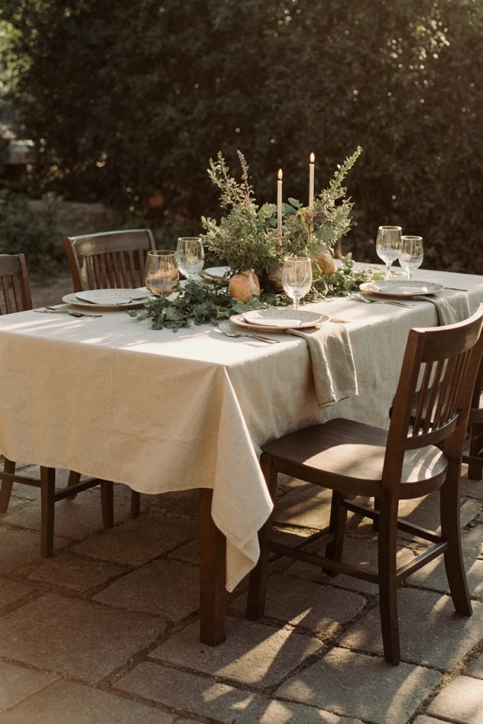 Earthy tones make autumn Outdoor Table Decor 2026 feel grounded. Warm oranges, wood textures, and rustic runners work well outdoors. Touches of ideas like dried branches or muted candles create depth for cozy seasonal gatherings, especially Halloween-adjacent evenings.