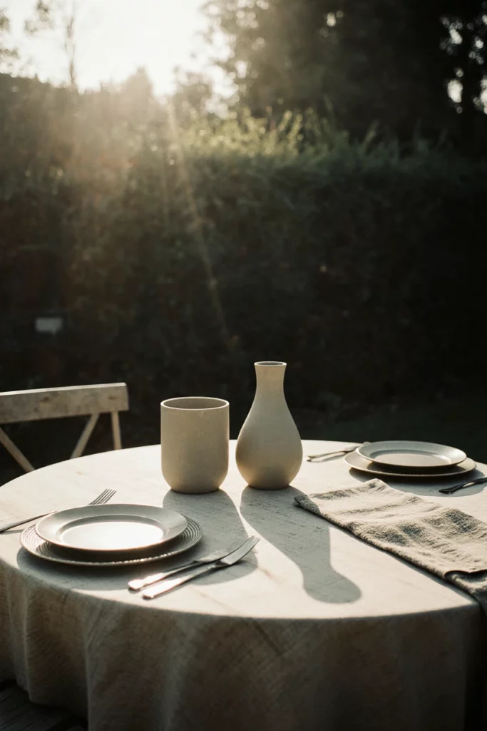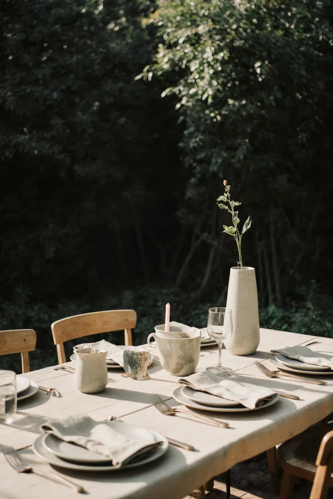 An uncluttered setup defines modern everyday outdoor table decor for 2026. Focus on two or three streamlined pieces: a textured vase, matte plates, and a single low arrangement. This minimalist look works equally well on patios and porches, where simplicity feels calming.