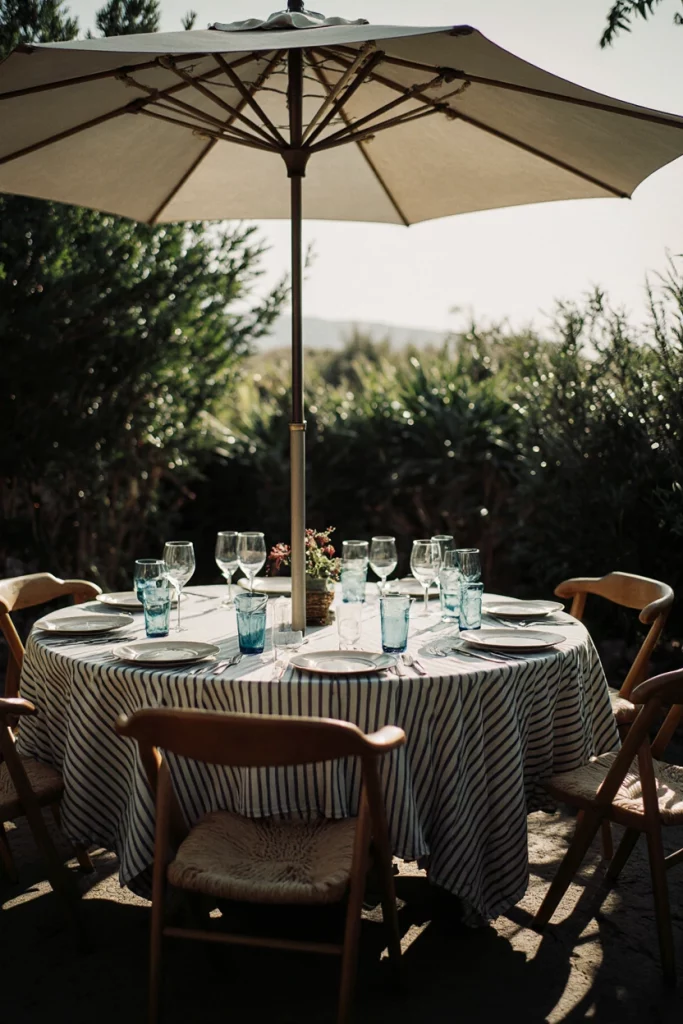 For sunny days, a crisp setting under an umbrella enhances Outdoor Table Decor 2026. Blue glassware and striped linens echo coastal energy. A summer palette keeps the mood light, while ideas like small bowl arrangements add subtle charm to the overall composition.