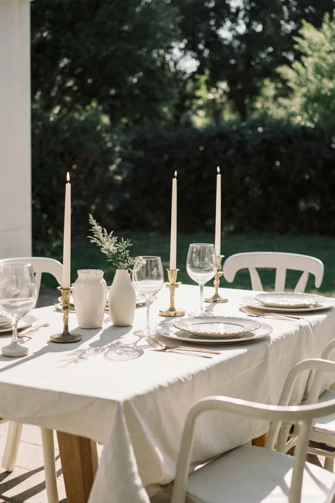 All-white table settings continue trending in Outdoor Table Decor 2026. Crisp linens, ceramic vases, and pale candles create quiet elegance. Because white bounces light beautifully, it works well on patios and blends with both simple and dramatic centerpieces.