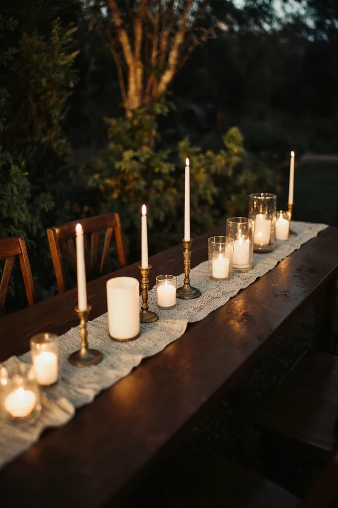 For outdoor table decor in 2026, soft candlelight still remains a popular choice. A long, do-it-yourself (DIY) runner with varying heights of candles adds dimension, while a bit of boho texture keeps things balanced. This arrangement is particularly effective at gatherings where a warm glow is ideal.