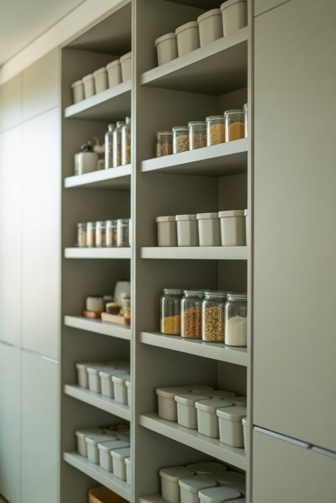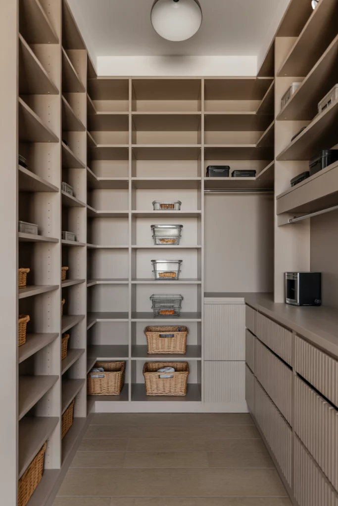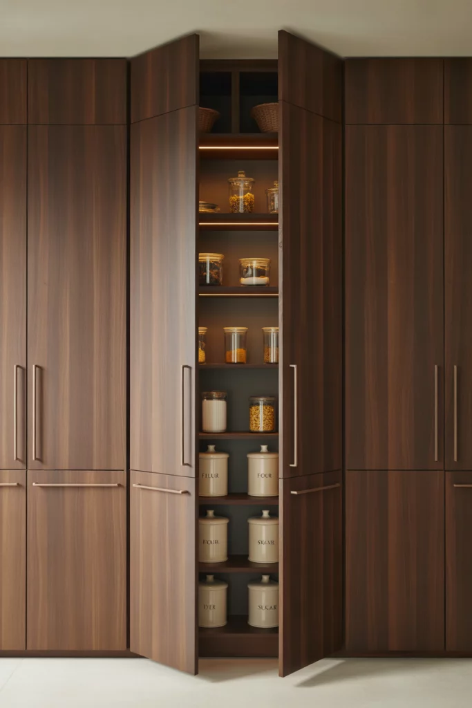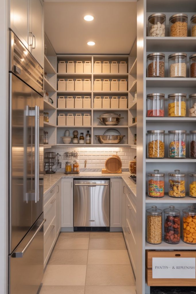 A large pantry can include zones for snacks, baking, appliances, and dry foods. Designers often build shaped layouts that make it feel like a full extension of a modern luxury kitchen. If your home has space, this idea creates a clutter-free lifestyle that feels both practical and beautiful.
