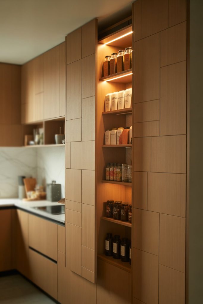 A hidden pantry built within full-height cabinets is a designer’s favorite for visual calm and clean lines. This extinguishes the need for a visible storage option for dry goods and creates a seamless design within a modern or modern luxury kitchen. This works really well for large layouts and small spaces, especially when the storage is designed to feel purposeful.