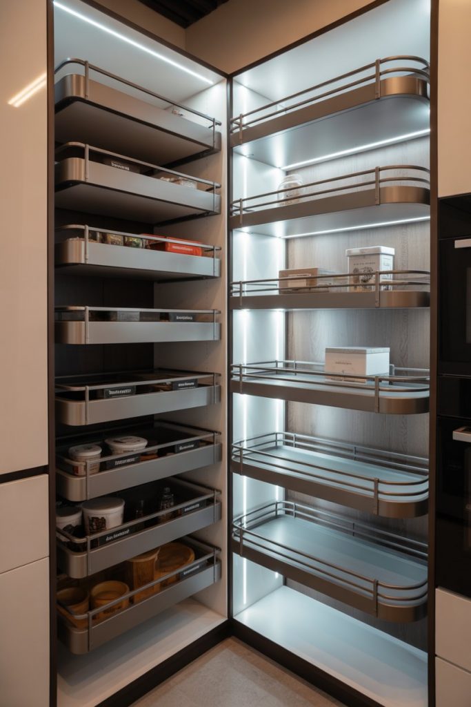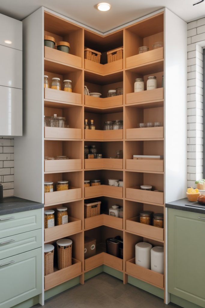 A shaped pantry with pull-out trays and rotating shelves maximizes visibility, making it ideal for small kitchens and ideas for walk-in spaces. Pull-outs help you reach items stored deep inside without bending or stretching. Many experts highlight this as one of the most convenient ideas for busy families who want quick access to ingredients while cooking.