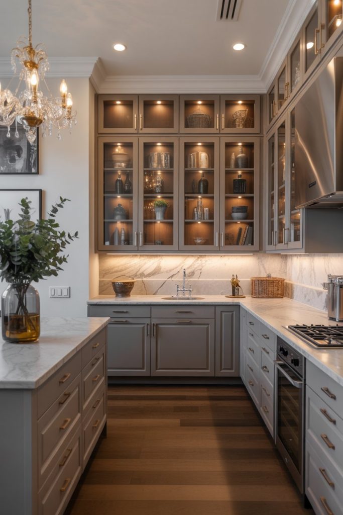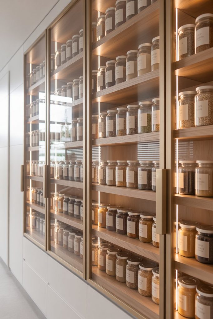 A pantry with glass doors adds a touch of luxury while encouraging consistent organization. Whether in a large home or a compact small kitchen, glass fronts make the space feel open and considered. Designers often pair this with matching bins and labeled jars to maintain a uniform visual style that complements the main kitchen.