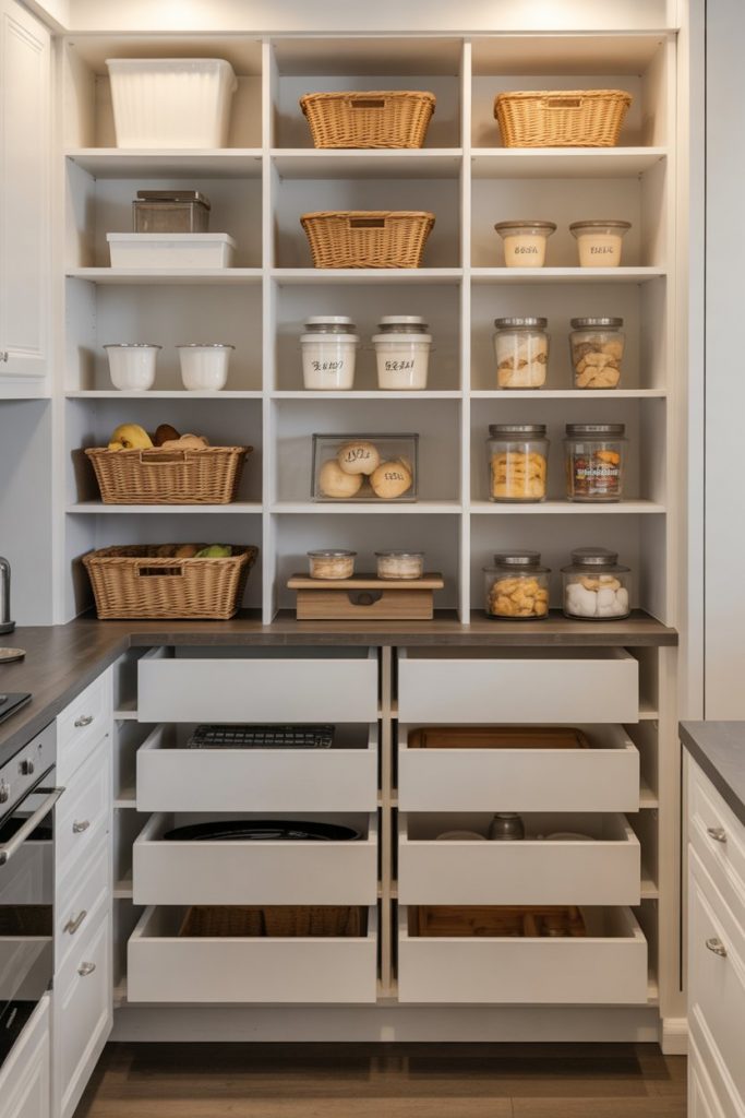 Deep drawers designed specifically for snacks, cereals, cans, or baking supplies are a rising 2026 trend. Home editors at Real Simple often recommend them because they keep everything visible and easy to grab—ideal for both large pantries and small spaces. Drawers fit neatly beneath shelving or counters for a clean, organized look.
