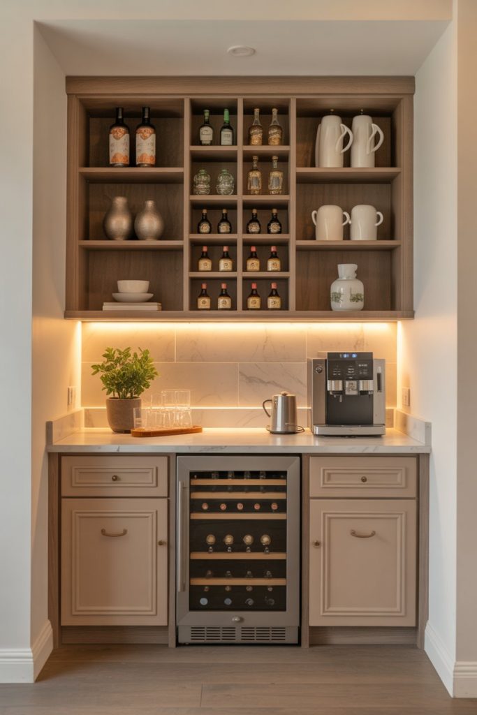 A butler pantry dedicated to beverages—coffee, tea, or wine—has become highly popular among design lovers who entertain often. Featuring small cabinets, a countertop, and appliance storage, it elevates the home while reducing clutter in the main kitchen. It works in both small walks and large layouts.