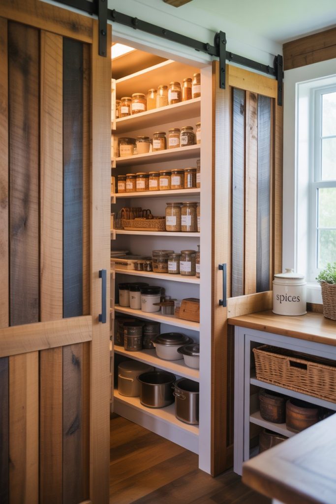 A reach-in pantry fitted with barn doors adds a cozy farmhouse touch while saving space in a tight corner kitchen or small kitchen layout. Sliding doors eliminate the swing radius of traditional hinges, making the pantry accessible even in narrow layouts. It’s a simple yet stylish upgrade for modern families.