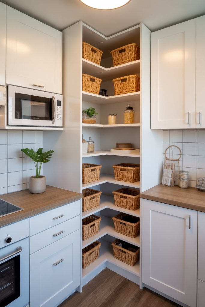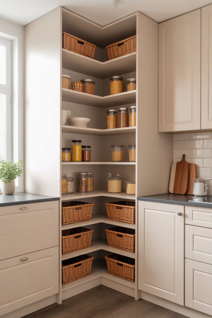 Urban apartments often require creative solutions, making a small corner-shaped pantry essential. With vertical storage, narrow shelves, and a compact footprint, this design works well for studio layouts. It ensures that even a small kitchen in a tight city apartment can feel organized and efficient.