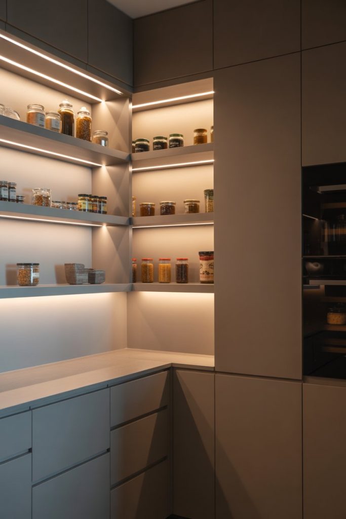 Integrated drawer lights, under-shelf LEDs, and soft ceiling fixtures dramatically improve visibility in both small spaces and large pantries. Many designers consider lighting one of the defining Ideas of 2026, because it elevates functionality and gives even a simple pantry a luxury feel. It’s practical, stylish, and universally appreciated.