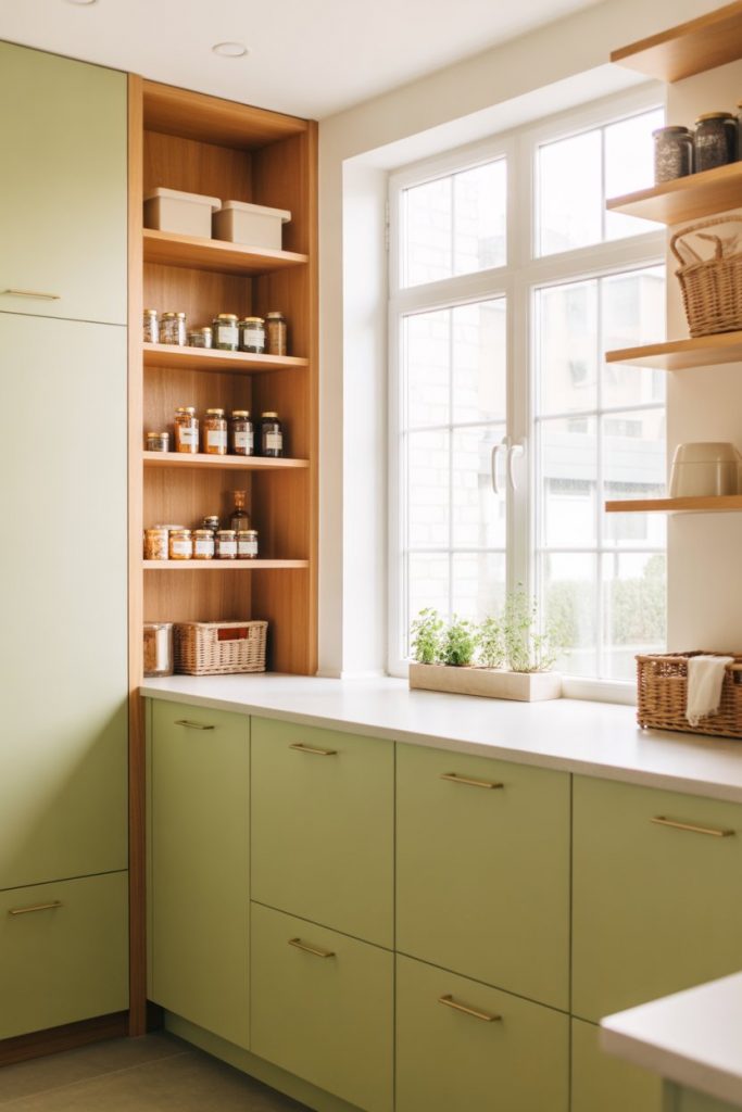 Adding a window to a pantry brightens the space and keeps it from feeling closed off. Natural lighting works well in walk-in and small kitchen layouts because it keeps the space feeling open and is especially good with soft-colored cabinets and open shelving. Designers remark that it’s a good mood detail for the home as well. \ ID28