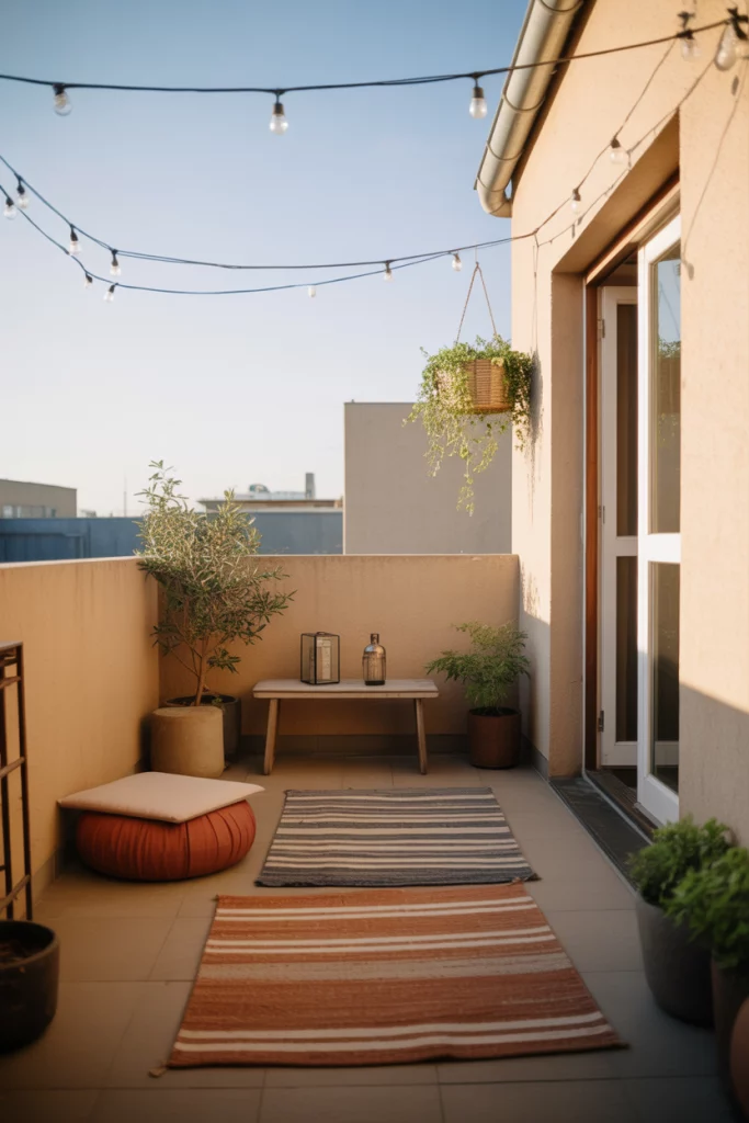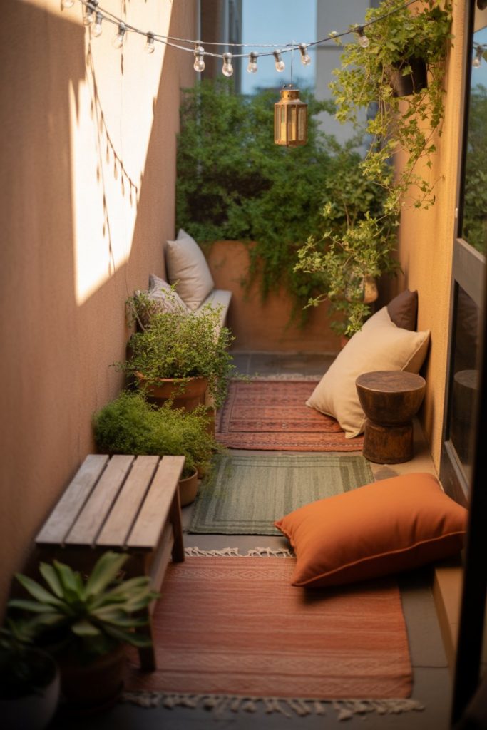 Transform a small apartment balcony into a cozy retreat by layering outdoor rugs, floor cushions, and weather-resistant throw pillows in complementary tones. This approach works beautifully on small space patios where traditional furniture feels cramped. Use a low-profile wooden bench or folding chairs that can be tucked away when not in use, and add a hanging lantern or string lights overhead to create intimacy without overwhelming the footprint.