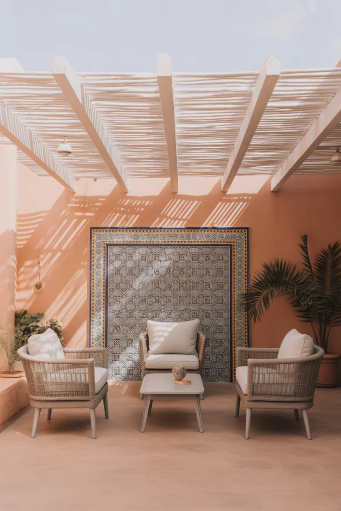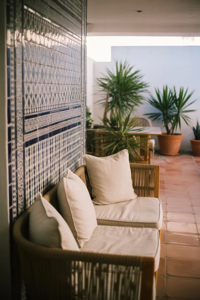 Create a stunning focal point by tiling one patio wall in vibrant colorful patterns—think Moroccan zellige, Spanish talavera, or Portuguese azulejo designs. Keep surrounding elements neutral to let the tile shine. This works beautifully on covered patios where the tile is protected from freeze-thaw cycles, particularly in Mediterranean-climate regions like coastal California.