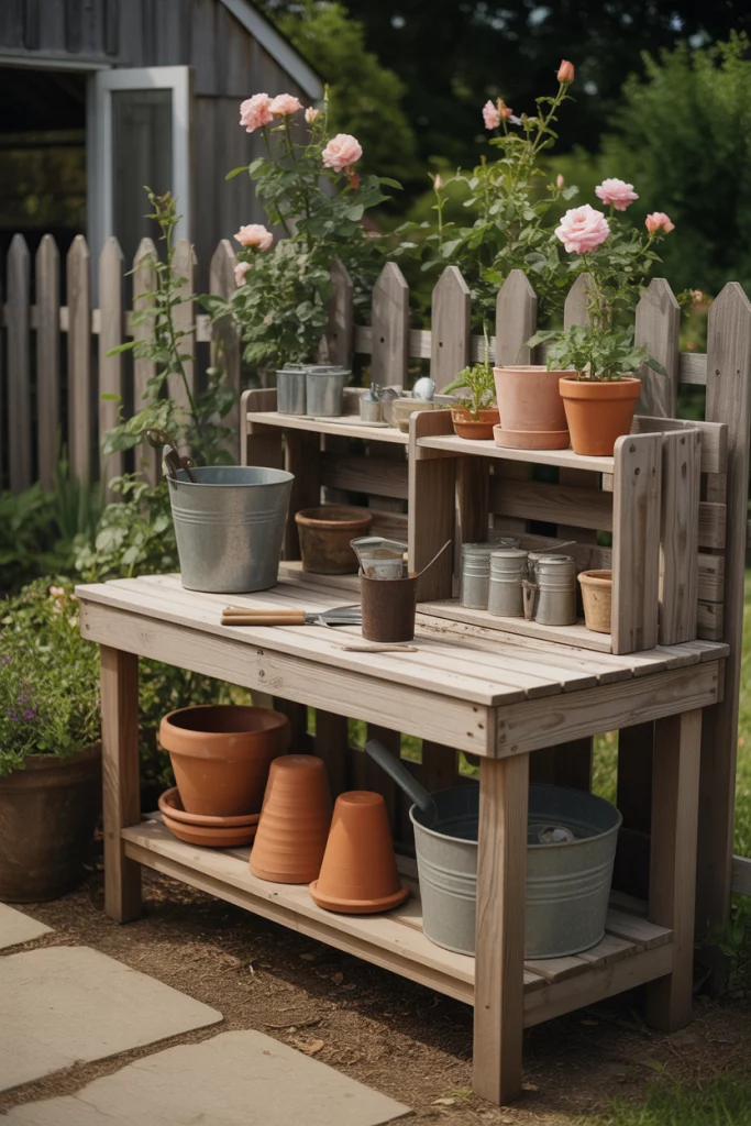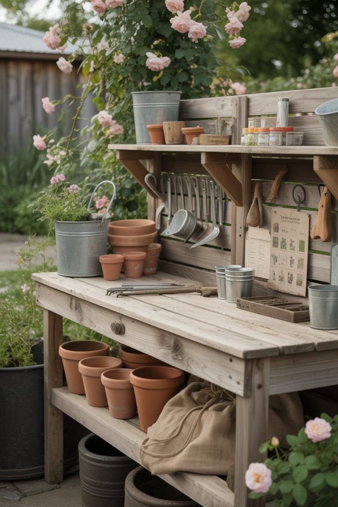 Repurpose a vintage workbench or install a new cedar potting station as both functional workspace and farmhouse decor. Add galvanized tool caddies, terra cotta pots in graduated sizes, and open shelving for supplies. This setup works on backyard patios near garden beds or along side yards where you need a dedicated zone for planting, repotting, and seasonal maintenance.