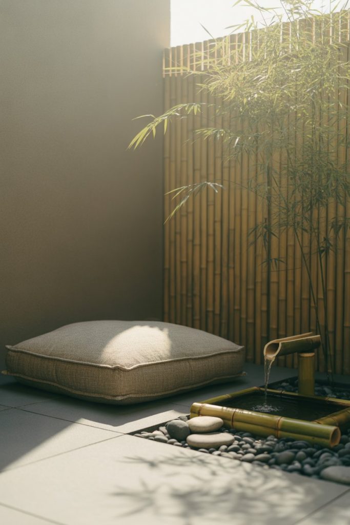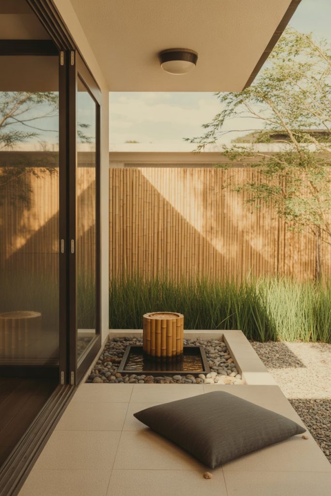 Carve out a cozy meditation corner with a single floor cushion, a small water feature, and carefully placed river rocks. Use bamboo screens for privacy and plant low-maintenance species like Japanese forest grass or black mondo grass. This approach suits small space patios where simplicity and intentionality take precedence over furniture volume.